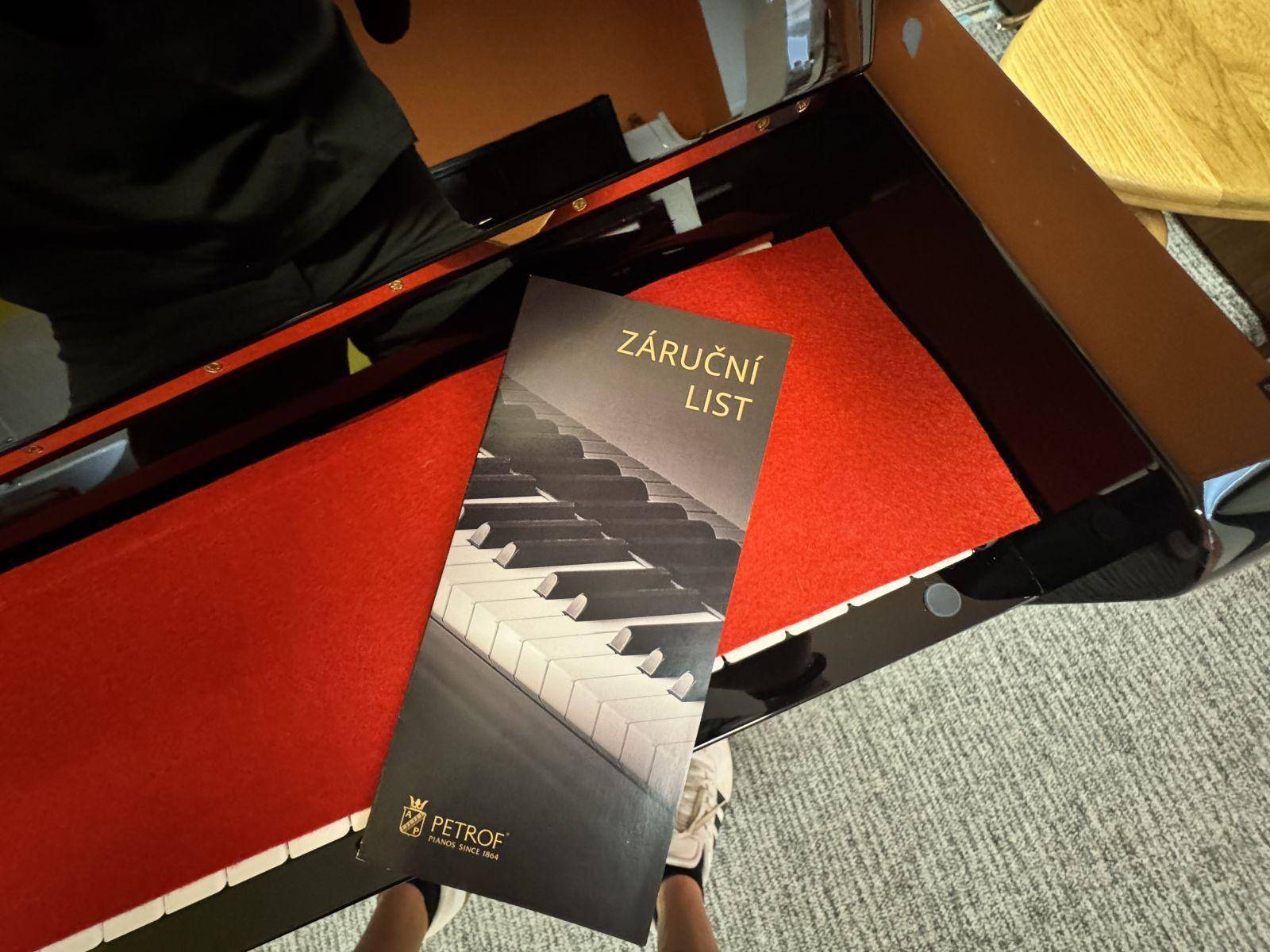 Petrof 118 P1 Nový nástrojProdáno Pianino v tovární záruce. Nabízíme k prodeji pianino Petrof 118P1 v provedení černý vysoký lesk. Původní majitel jej vlastnil 9 měsíců. Pianino v tovární záruce. Vybavené kladívky Louis Renner, ladění 442Hz, samozřejmostí je celková regulace apod. Písemná garance po dobu 5 let. Záruční a pozáruční servis, doprava do 100km v ceně nástroje. Stěhování dle dohody. K pianinu náleží cesrtifikace použitých materiálů a orig. produktu Petrof. Pro více informací nás neváhejte kontaktovat. | |